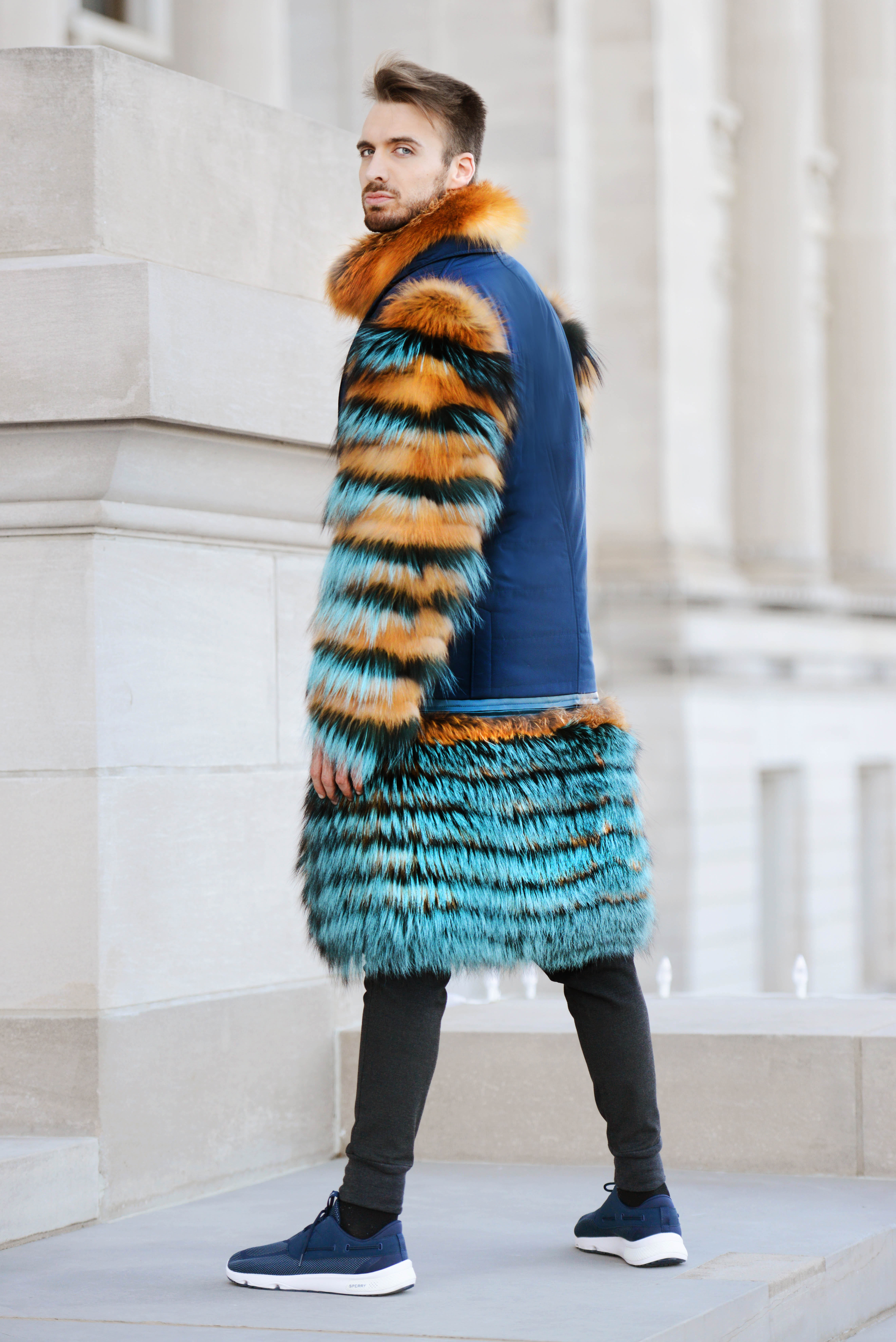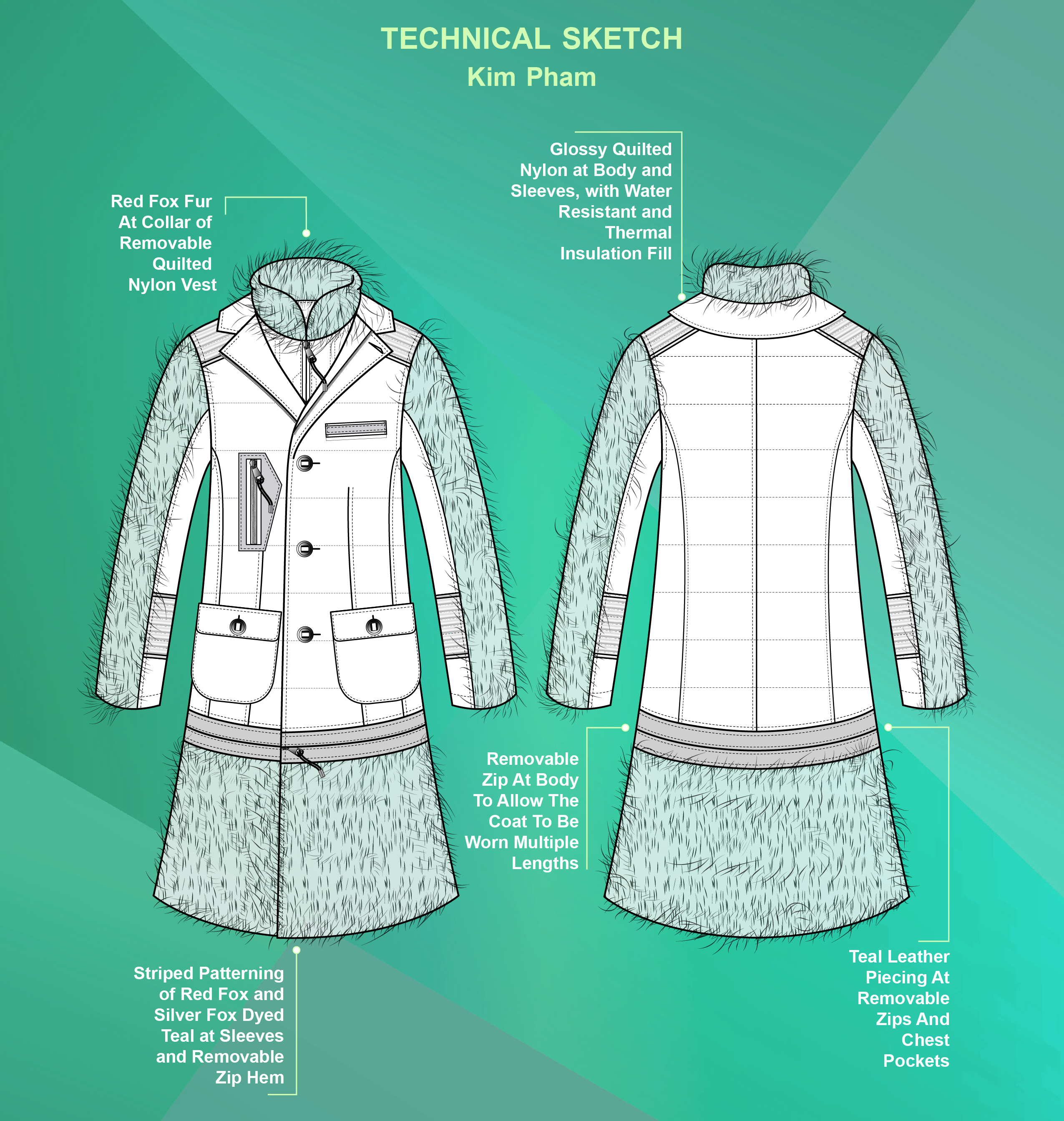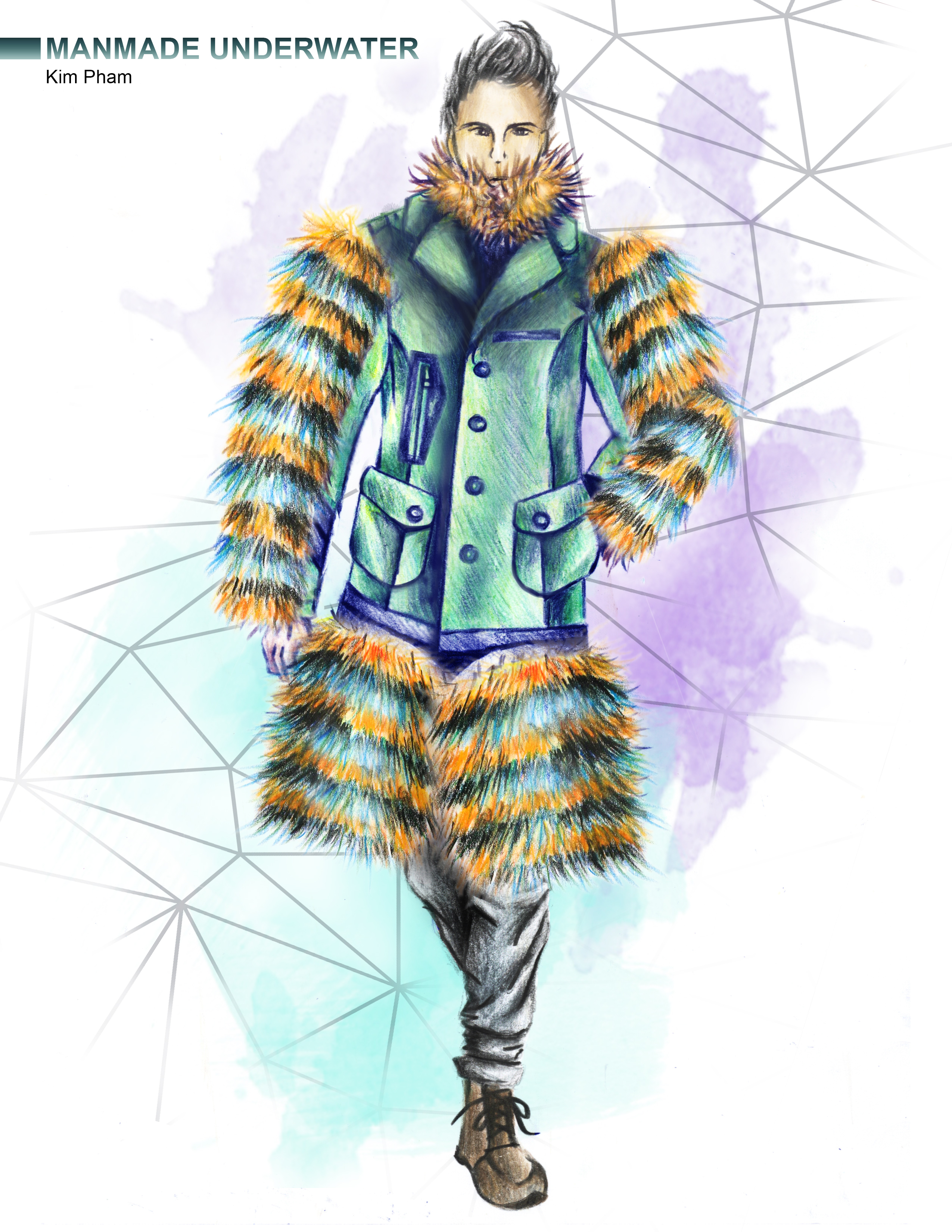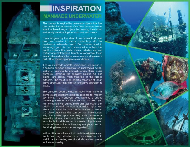 Just as manmade objects underwater, my design is a collision between opposites, an unexpected collaboration of luxurious fur and activewear. Mixed media elements combines the brilliantly colored fur, soft leather, and glossy nylon materials of the rugged outdoors. The result is an eclectic collection of urban active streetwear that form an innovative approach to luxury.